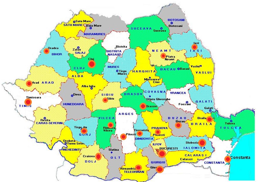 Legenda: Acoperirea terestra este asigurata in localitatile marcate pe harta.
